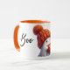 Conheça esta queda com esta caneca de dois tons absolutamente adorável! Ele apresenta um fantasma doce, covarde vestindo um enorme, texturizado gorro laranja e adoravelmente abraçando uma pequena e sorridente abóbora de Jack-o-lanterna. Com seu interior e manípulo laranja brilhante, esta caneca captura perfeitamente o espírito quente e reconfortante do outono, Halloween e época de colheita.