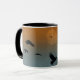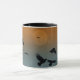 Crows fly into a ombre colored night sky filled with stars and a full moon.