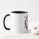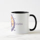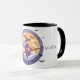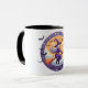 Esta personalizável design de caneca do "Dia das Bruxas" apresenta uma bruxa fofa voando sobre sua vassoura com um texto que você pode personalizar.