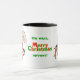 Esta é uma caneca de Holiday fofa e engraçada que certamente trará um sorriso! Cada lado mostra um Papai Noel exasperado sendo mordido por um cachorro. O texto vermelho e verde no meio diz "Oh bem, Feliz Natal de qualquer forma!"