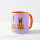 Ilustração de três cachorros franceses do Bulldog de diferentes cores em abóboras vestidas em trajes de Dia das Bruxas.