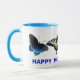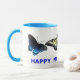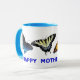 As fotografias de quatro borboletas norte-americanas diferentes são usadas para projetar uma caneca feliz do presente do dia das mães. O monarca, swallowtail oriental do amarelo do tigre, vermelho manchou roxo e as borboletas azuis atadas orientais são incluídas neste design. Um grande presente da borboleta da natureza do dia das mães, caneca atual para sua mãe, avó, Nana, irmã, tia.