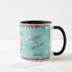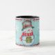Nesta caneca, um boneco de neve feliz está vestido com seu chapéu de cima e cachecol contra um sutil fundo azul e floco de neve branco. No topo e no fundo estão bordas de confete vermelho. O texto vermelho em ambos os lados diz "FELIZ e BRIGHT", e o nome do seu filho está em cinzas no fundo de um lado. Bonita para crianças de todas as idades!