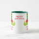 Esta é uma caneca divertida para a época de Natal! Ele apresenta uma imagem de meias verdes listradas e calçados de elfo em cada lado, com o texto vermelho abaixo que diz "Prendendo os Misturos". No centro está um campo de texto personalizado em vermelho que diz atualmente "Feliz Natal", mas você pode mudar para qualquer coisa que quiser. Bonita, e definitivamente ganhará alguns sorrisos de férias! *Crédito de Design para Prettygrafikdesign.