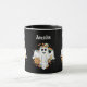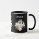 Uma caneca com uma ilustração de um fantasma sorridente. Decorado com flores, arco-íris e morcegos.
