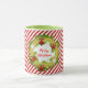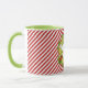 A caneca verde-clara apresenta o texto Feliz de Natal na coroa de Natal em um padrão listrado vermelho e branco.