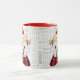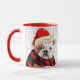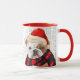 Um Bulldog Inglês está vestido para o feriado nesta caneca de Natal sazonal e divertida para o amante do cachorro com fundo de arte 'woof'.