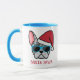 Fique aconchegante com esta caneca de café de Papais noeis. Esta charmosa caneca com um toucinho francês de merle azul em um chapéu de Papai Noel e óculos de sol é a maneira ideal de aquecer durante o feriado. Compartilhe a alegria ou aproveite tudo para si mesmo.