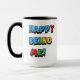 Mug alegre e alegre com cores primárias brancas de fundo "Happy Being Me" com alça preta e dentro.