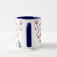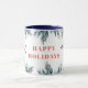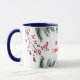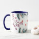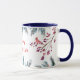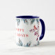 Estilo rústico moderno, caneca de café sazonal de inverno com término marinho e caçador de mosquiteiros verdes, bagas ocas e duas aves cardeal vermelhas juntamente com o roteiro de tipografia laranja editável "Feliz Natal". Fácil de personalizar com o seu texto ++++++++++ Um belo presente de Natal para parceiros familiares ou empresariais.