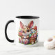 Coelhinho da Páscoa bonito sentado ao lado de um cheio de cesto de coelho de desenho animado de ovos de Páscoa tingidos. Esta caneca diz tia, mas você pode personalizar para dizer qualquer nome ou membro da família.