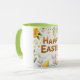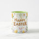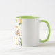 Celebre a Páscoa com esta alegre e brilhante design de caneca de Mens. As palavras "FELZ PASCOA" são exibidas de forma destacada em uma matiz quente de ouro, cercada por um encantador conjunto de flores brancas tipo margarida e uma folhagem verde esmagadora.