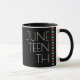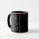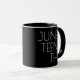 Uma caneca de café da comemoração de Junta. Ele tem um design que inclui um fundo preto, uma faixa vermelha, preta e verde, e as letras estão em branco.