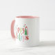 Esta caneca lúdica apresenta o ditado "feriados felizes" com cores alternadas em letras minúsculas com sotaques brilhantes. As cores incluem rosa, vermelho, verde e azul claro.