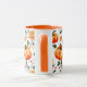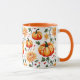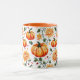 Mug in a fall-themed pattern featuring vibrant orange pumpkins intertwined with blooming chrysanthemums in warm yellow and orange hues, creating a festive harvest-inspired design