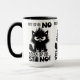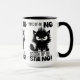 A funny, sarcastic black-and-white graphic design showcases a black cat with frazzled fur and a scowling expression. The black handwritten text says, "First of all, no. Second of all, still no!" Available on a wide variety of products, this design makes a perfect gift for cat lovers.
