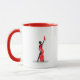 O dançarino do Flamenco diminuiu o design em vermelho e preto. Ela está segurando um fã e parada em uma plataforma.
