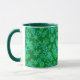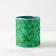 Mug em um padrão geométrico de flocos de neve moderno - tons verdes claros, azuis gelados, cobalto e branco, em um fundo verde esmeraldo profundo