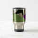 A imagem na caneca floral, de aço inoxidável da viagem ao trabalho é um wildflower cor-de-rosa-roxo da corriola sob uma folha, quando outras folhas moldarem sombras em uma cerca de madeira.