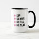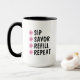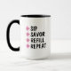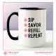 Esta caneca de café personalizável apresenta flores cor-de-rosa e pretas simples com tipografia em negrito que diz, “BEBER, SABOREAR, RECARREGAR, REPETIR.” Modifique as quatro áreas de texto para criar um presente único para familiares, amigos, colegas de trabalho ou qualquer amante de café na sua lista de compras.