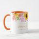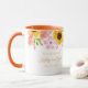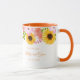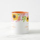 Esta caneca floral tem girassóis, papoulas e rosas silvestres com folhas ao redor da borda superior da caneca sobre um fundo branco. Texto 'Salve a data' em melão esperando por você para personalizar. O interior da amostra mostrada é laranja suave. Escolha a cor do interior para combinar com o seu gosto. Personalize esta caneca ou compre como projetado.