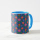 Uma Mug de Café Cerâmica Branca, com lábio e alça azul escuro e um padrão colorido de Flores e Bolinhas Laranja e Rosa em um Fundo Azul Profundo que você pode mudar se quiser. (Preto, Branco, Amarelo Ouro e Turquesa são alternativos excelentes!) Parte da coleção Posh & Painterly 'Rangoli', este padrão na moda, marcado pode ser ajustado para ajustado qualquer caneca.