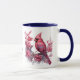 Aqui está uma caneca de monograma atraente que é perfeita para a temporada de Férias, mas é apropriada o ano inteiro. Ele apresenta uma imagem de aquarela de um cardeal vermelho gravado em um ramo de flor rosa. A imagem é impressa duas vezes na caneca, com as duas letras monograma em azul entre elas.