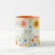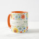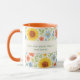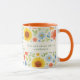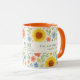 Uma caneca decorada com um padrão floral com girassóis. Texto: Levante e brilhe como um girassol. Personalize e adicione suas iniciais e nome do monograma.