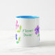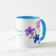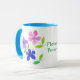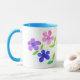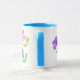 Uma caneca de café branca e chique com lábio e punho azuis, decorada com um motivo floral, de uma colagem de papel pintado à mão por Judy Adamson.