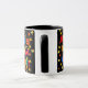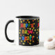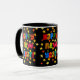 Uma caneca de café de novo, com 'Feliz ano novo' em letras multicoloridas e laranja e amarelo começa espalhada por todo o fundo preto. De um design de colagem de papel pintado à mão por Judy Adamson.