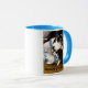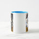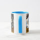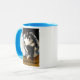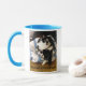 Uma fotografia de um gato de smoking preto e branco bonitinho está a desfrutar do seu presente de Natal parcialmente não embrulhado. O texto diz: "Feliz Natal!" A design é impressa em ambos os lados das canecas. Obrigado por comprar em CherylsArtPhotos no Zazzle.