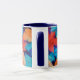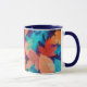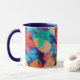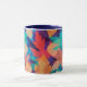 Folhas coloridas vermelhas, amarelas, laranja, azuis, ciano, verde, turquesa e outono lacrimogêneo caídas sobre fundo azul escuro e violeta. Pintura de fantasia.