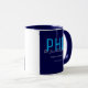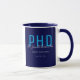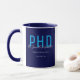 Uma caneca de graduação de doutorado que apresenta o nome do formando, o campo de estudo e a data de formatura. A caneca inclui o nome em uma fonte de script de escrita manual. O design tem um esquema de cor azul e branca. É excelente como um guardião ou um favor do partido. Basta adicionar as informações do formando, adicionar esta caneca ao seu carrinho e parabéns neste marco importante! Formando Azul Nome Grau PhD Mug Holidayday Design | ©Melissa Patton - Designer