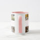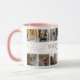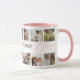 A primeira caneca de dia de as mães bonita com 14 fotos da família para você substituí-la pela sua, o texto "primeiro dia de as mães" em uma letra de roteiro elegante da rosa claro, o bonito ditado "AMA VOCÊ MAMÃE" e o nome da criança.