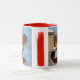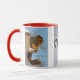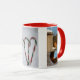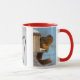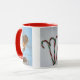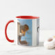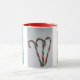 Uma fotografia de um Esquilo de Cauda Fox do Kansas num alimentador num polo telefônico com céu azul. Em Nickerson Kansas USA. E no meio do Candy Cane. Isso está em um MUG.