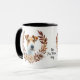 Uma bonito coroa de outono em tons de cinamão marrom, bronzeado e creme rodeia a imagem aquosa de um lindo Cão Fox Terrier. A imagem é impressa duas vezes na caneca, com seu texto personalizado entre eles.