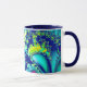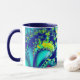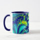 A caneca combo azul abstrato apresenta arte fractal em cores vibrantes (azul, ciano, verde e roxo).