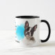 Um belo retrato de um Bulldog Francês preto-e-branco é a característica em dois lados desta caneca. Cada imagem é colocada sobre um fundo azul brilhante de filtro. Entre as duas imagens está o texto que descreve esse companheiro de amor leal e divertido, com "o BULLDOG FRANCÊS" em preto no fundo. Todo o texto é facilmente personalizado para qualquer coisa que você preferir; descreva seu próprio amigo leal!