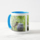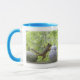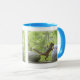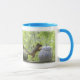 Uma foto de um esquilo que empurra a tampa fora de um frasco de biscoito cerâmico azul e branco, com seu pé que empurra contra uma rocha grande para a força de alavanca. Esta imagem engraçada do esquilo vem em lotes de presentes diferentes da foto e pode ser personalizada com seu próprio texto