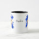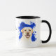 Um belo retrato de cor de água de um Labrador Retriever amarelo se destaca contra um fundo brilhante de pintura abstrato azul. A imagem está em dois lados da caneca, com seu nome ou outro texto personalizado a preto entre eles.