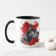 Um belo retrato de cor de água de um Grande Dane preto se destaca contra um fundo brilhante de pintura de abstrato vermelho. A imagem está em dois lados da caneca, com seu nome ou outro texto personalizado a preto entre eles.