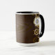 Fundo de madeira castanho com fundo marinho, cordilheira mecânica, volante antigo, âncora de ouro e diversas engrenagens de ouro e latão. Estilo Steampunk.