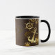 Fundo de madeira castanho com fundo marinho, cordilheira mecânica, volante antigo, âncora de ouro e diversas engrenagens de ouro e latão. Estilo Steampunk.