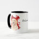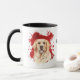 Um belo retrato de cor de água de um Retriever de Ouro se destaca contra um fundo brilhante de pintura de abstrato vermelho. A imagem está em dois lados da caneca, com seu nome ou outro texto personalizado a preto entre eles.