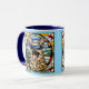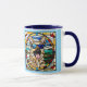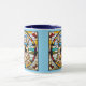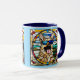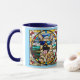 A cute funny dog coffee mug featuring a German Shepherd wearing sunglasses portrayed in stained glass.