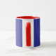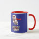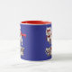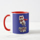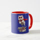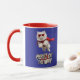 A cute funny superhero coffee mug featuring a white Persian cat flying in the air with a red cape flowing behind.