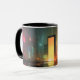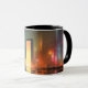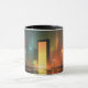 A vibrant city skyline with towering skyscrapers bathed in neon lights reflecting in water. The central structure is highlighted with a warm glow.