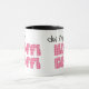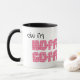 Uma bonita caneca branca de dedo, com uma maçaneta e uma maçaneta pretas e "eu gosto de café" em língua galesa. As letras estão cheias de um padrão de Gingham de Cheque Vermelho e Branco.