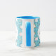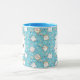 Uma caneca com um padrão de gato giro, colocada sobre um fundo azul e decorada com arco-íris e estampas de pata e muito mais.