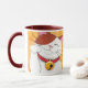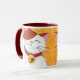 Design afortunado bonito da caneca do gato de Maneki Neko. O gato de chita branco e marrom alegre que senta-se em uma posição beckoning associou com os gatos de Maneki Neko do japonês. Veste um colar vermelho com um sino dourado enorme e tem sua pata esquerda ou direita aumentada segundo que lado da caneca você olha. Cuteness do gatinho para amantes do gato. Faria um grande presente! Criado de um © original da pintura Lisa 2009 Marie Robinson